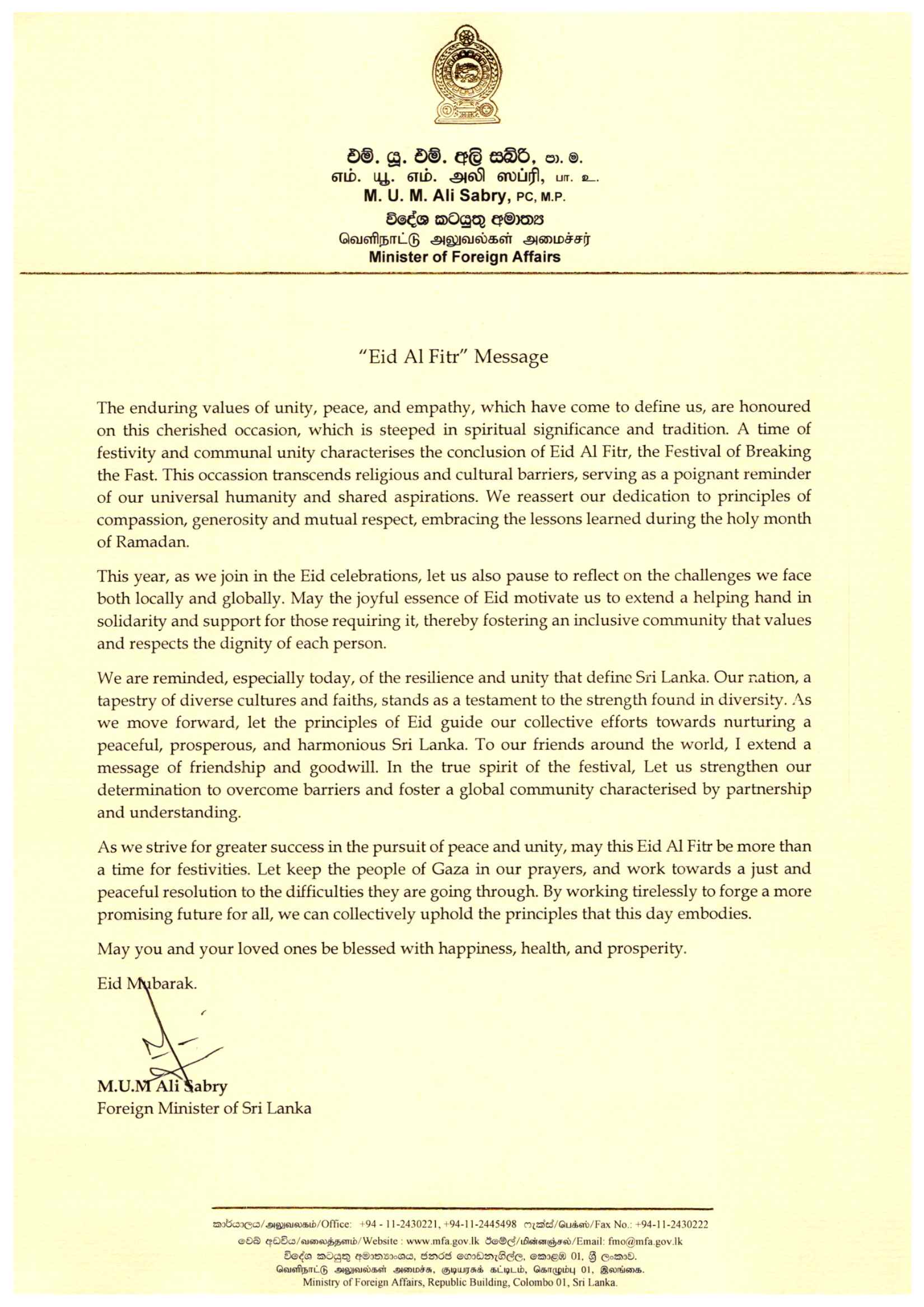 'Eid Al Fitr' Message of Minister of Foreign Affairs